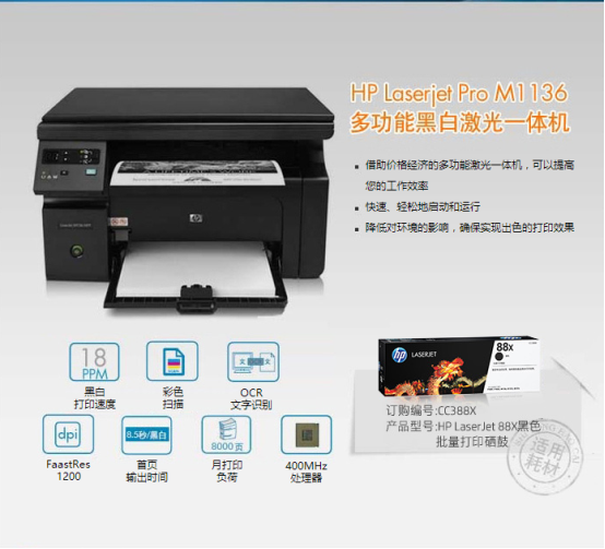 惠普(HP)M1136 多功能三合一黑白激光一體機(jī) (打印 復(fù)印 掃描)